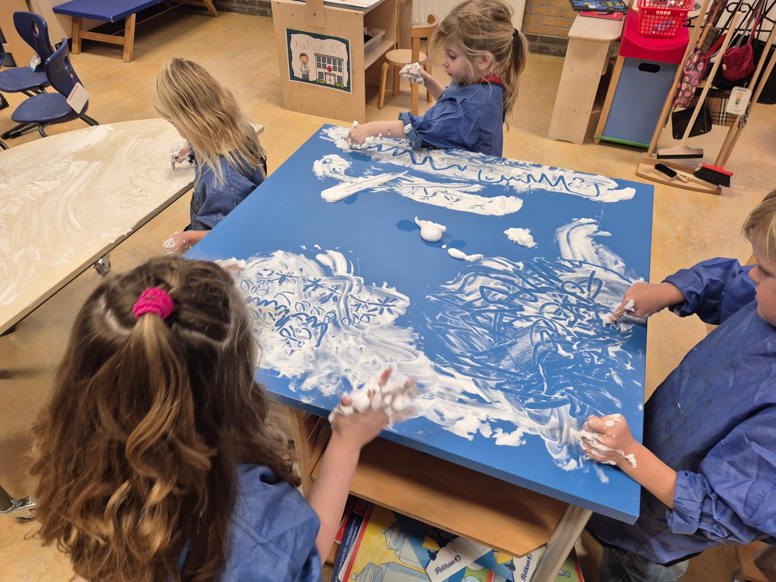 We zijn binnen ook verdergegaan met de sneeuw. We hadden als knutselopdracht een sneeuwpop die ze konden maken, we hebben een luisteropdracht gedaan waarbij je goed moest luisteren wat voor dingen je moest tekenen op je sneeuwpop en we hebben de schrijfdansles in het sneeuwthema gemaakt. Er lag op elke tafel sneeuw (scheerschuim) en juf vertelde een verhaal over pinguïns. Bij dit verhaal maakten de kinderen een winters landschap. Er waren hoge bergen, sleeënde pinguïns en ijskristallen.